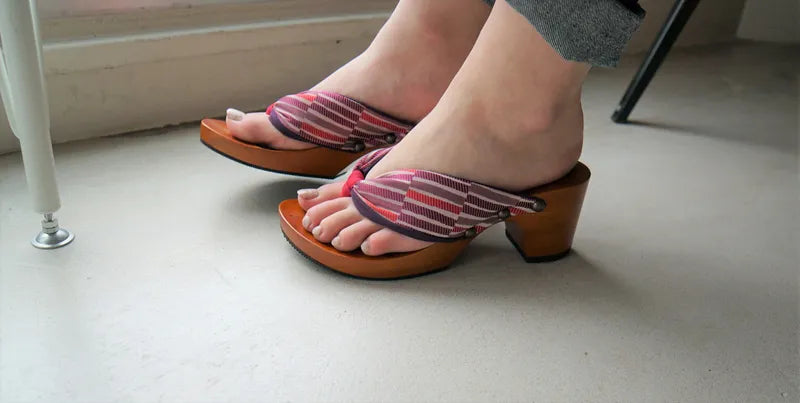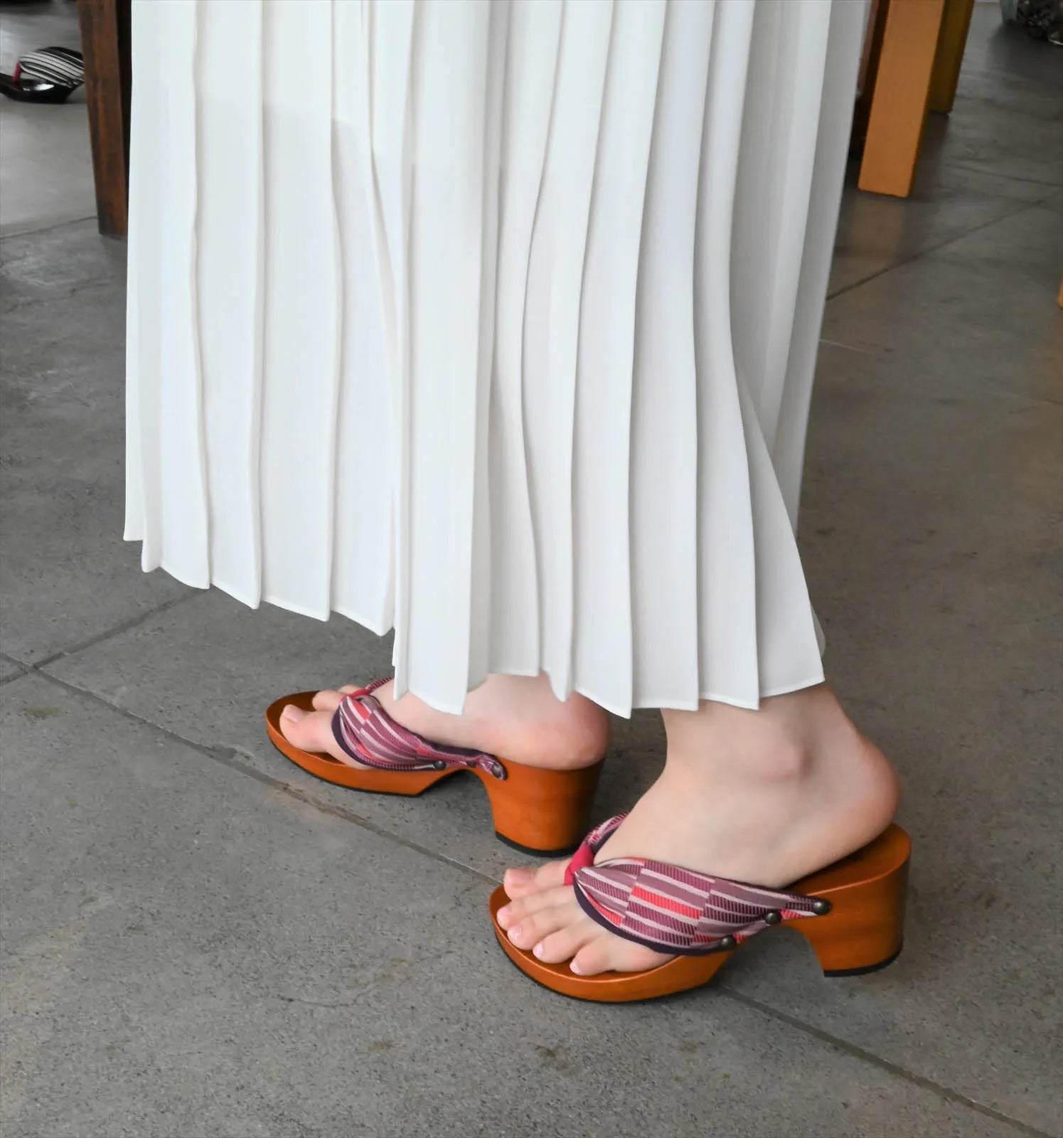 足裏にフィットする様に滑らかに 削った木地と、クッション材入りの鼻緒が特徴。
