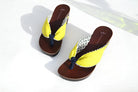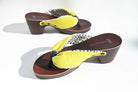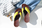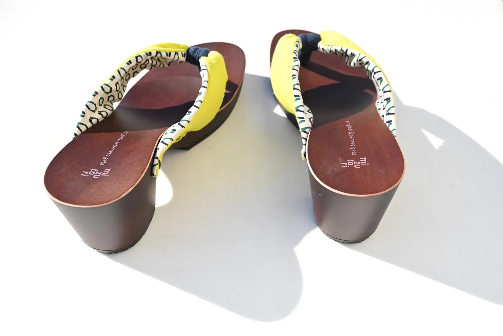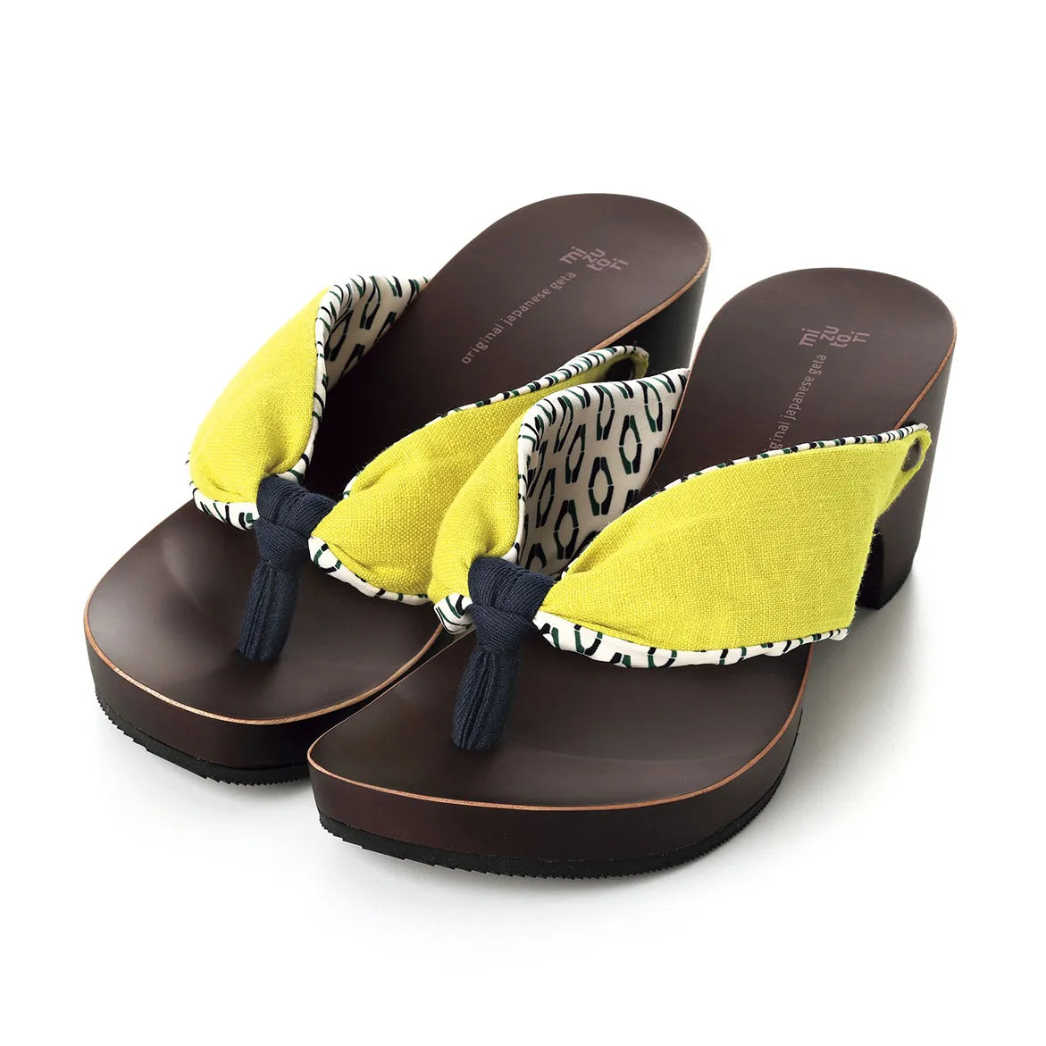 元気なライムイエローの表地からチラリと覗く幾何学柄の裏地が可愛い1足。パキッとした夏らしいカラーが足元を明るく彩ります。