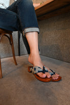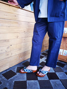 明治31年創業<野村織物>の久留米絣を使用。翡翠のような緑色の横糸を使用して織られた生地に、程よいかすれ感のあるスクエアが並ぶシンプルで合わせやすい1足です。