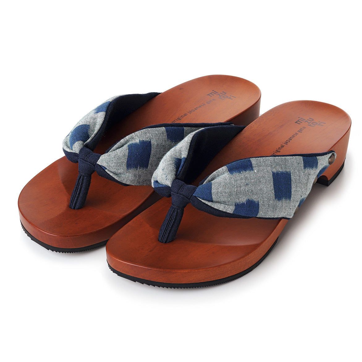 足裏にフィットする様に滑らかに削った木地と、クッション材入りの鼻緒が特徴。