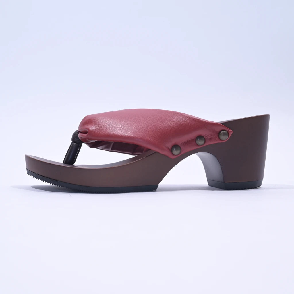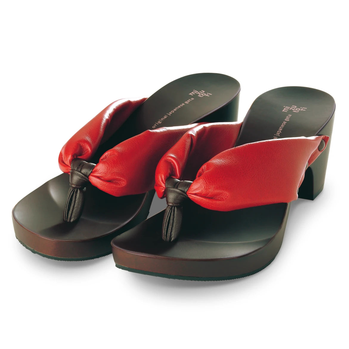 足裏にフィットする様に滑らかに 削った木地と、クッション材入りの鼻緒が特徴。