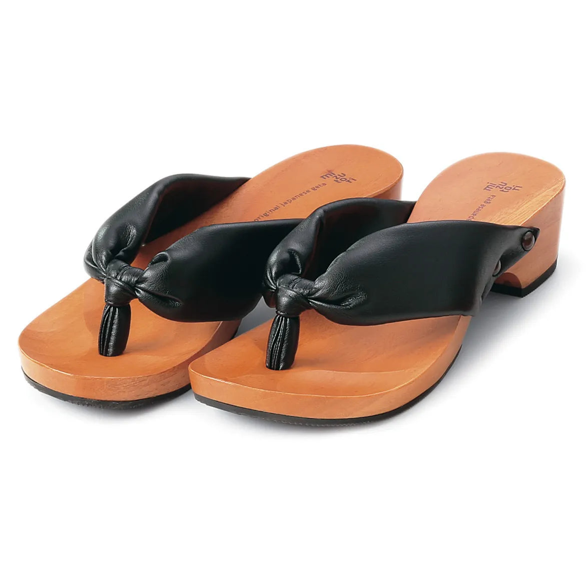 They feature smoothly carved wood to fit the soles of the feet and cushioned thongs.
