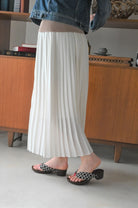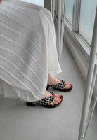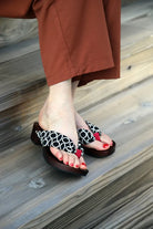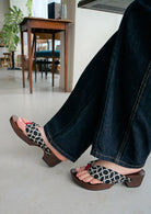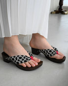 A pair of shoes with a fun geometric pattern that is easy to coordinate with other items.