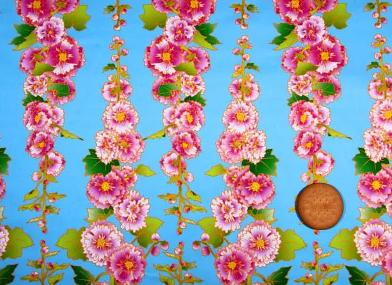 The vibrant blue and pink hollyhock flowers add a beautiful and healthy glow to your feet.