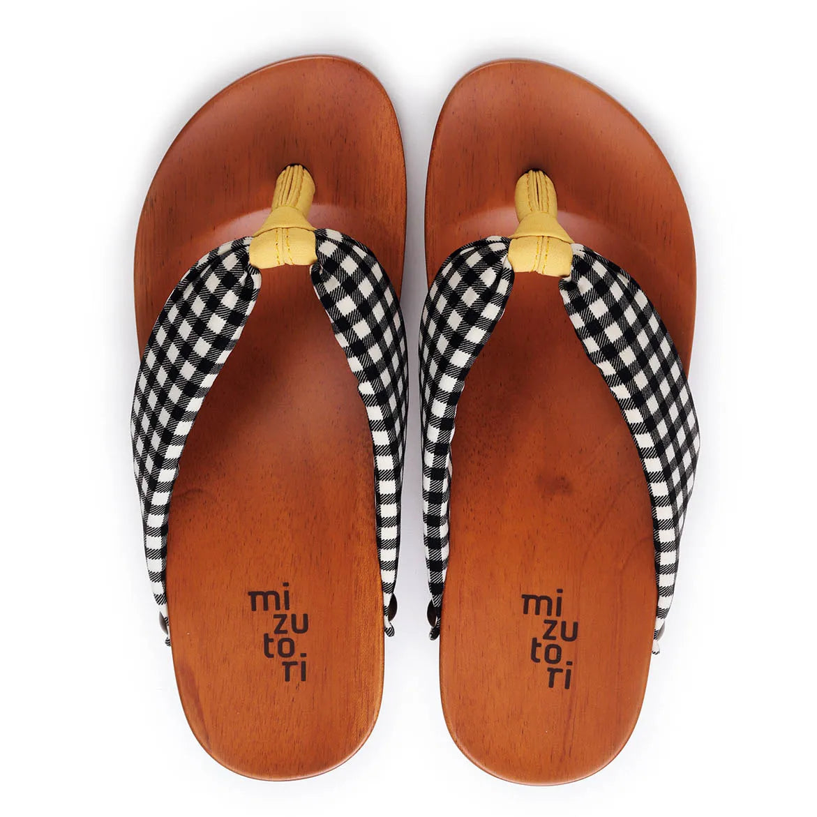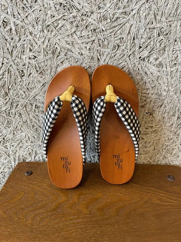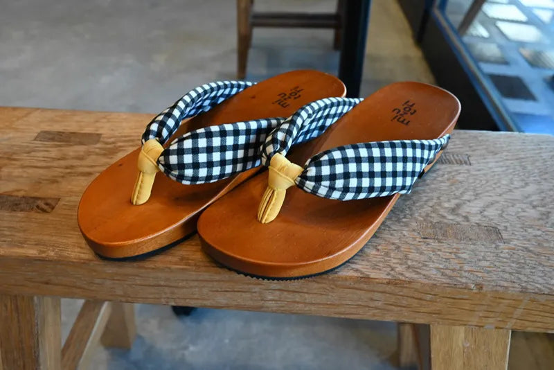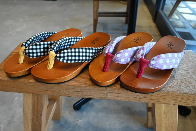 足裏にフィットする様に滑らかに削った木地と、クッション材入りの鼻緒が特徴。