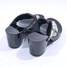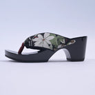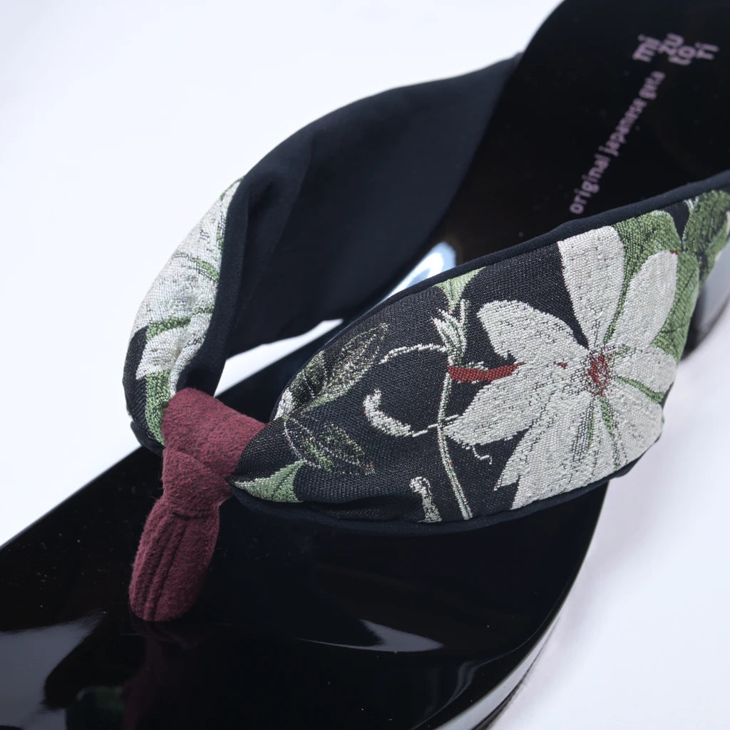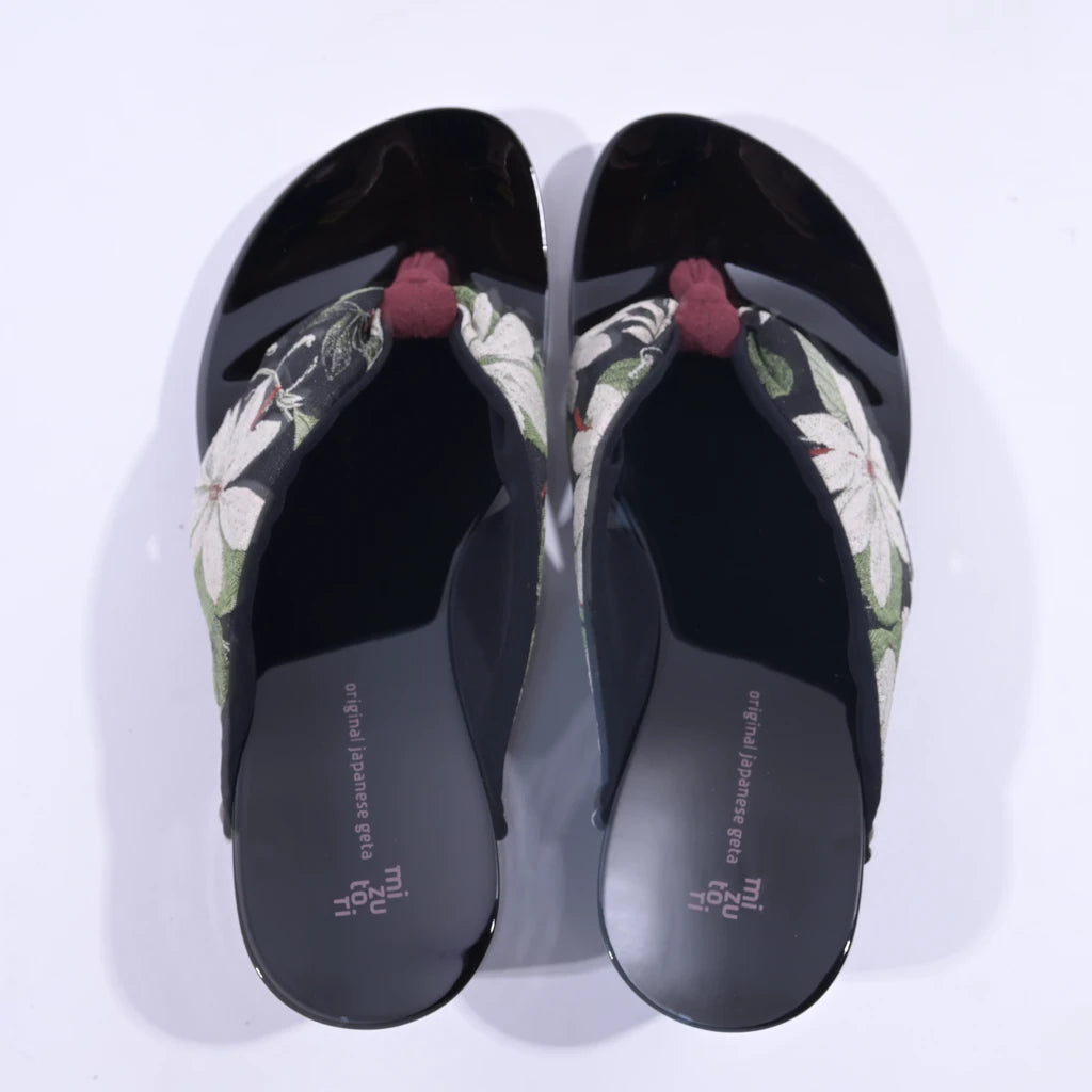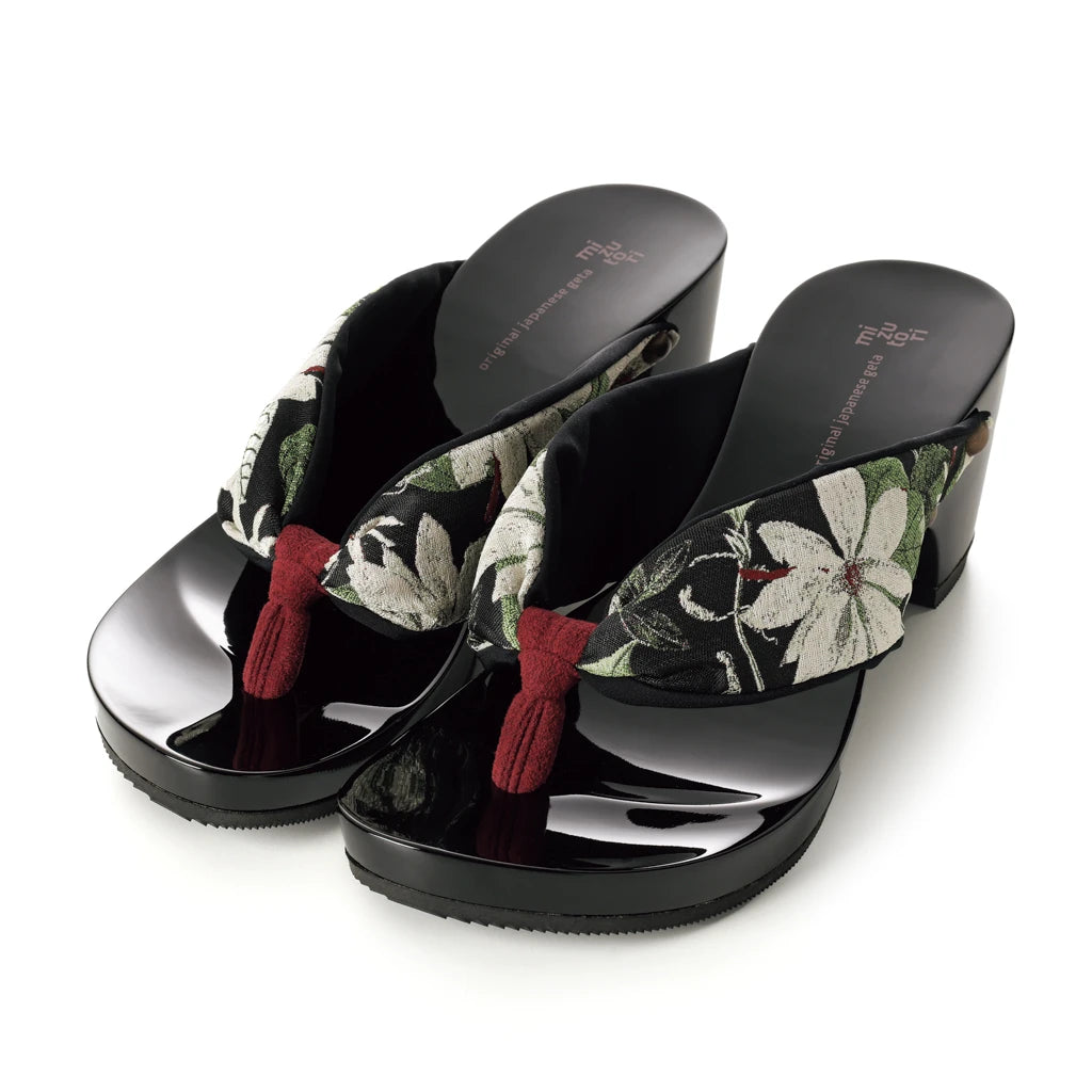 凛とした白い大輪の花がシックな黒の台に映えるモダンなモノトーン配色がおしゃれ。スタイルアップも叶える優雅な1足です。