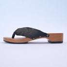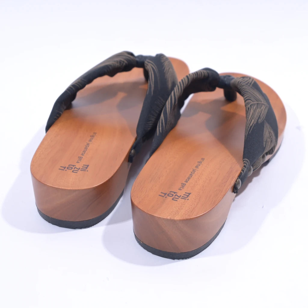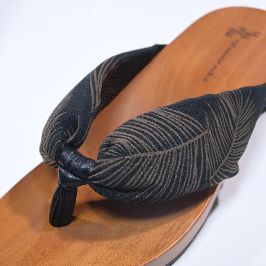 足裏にフィットする様に滑らかに削った木地と、クッション材入りの鼻緒が特徴。