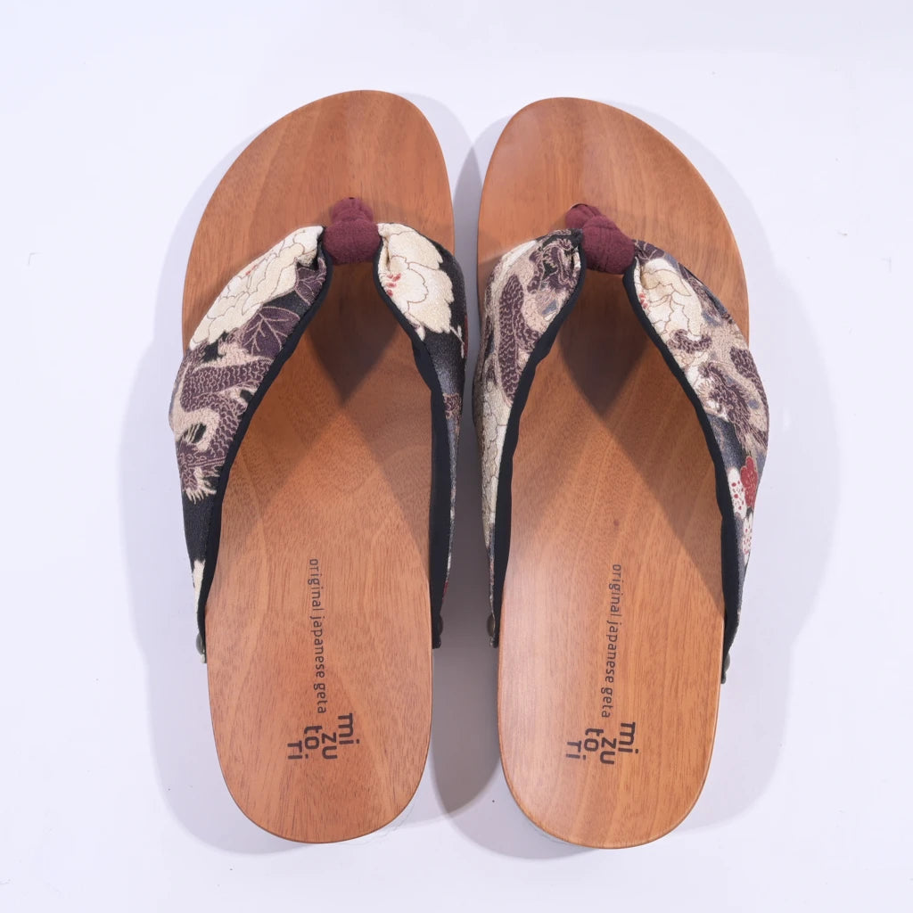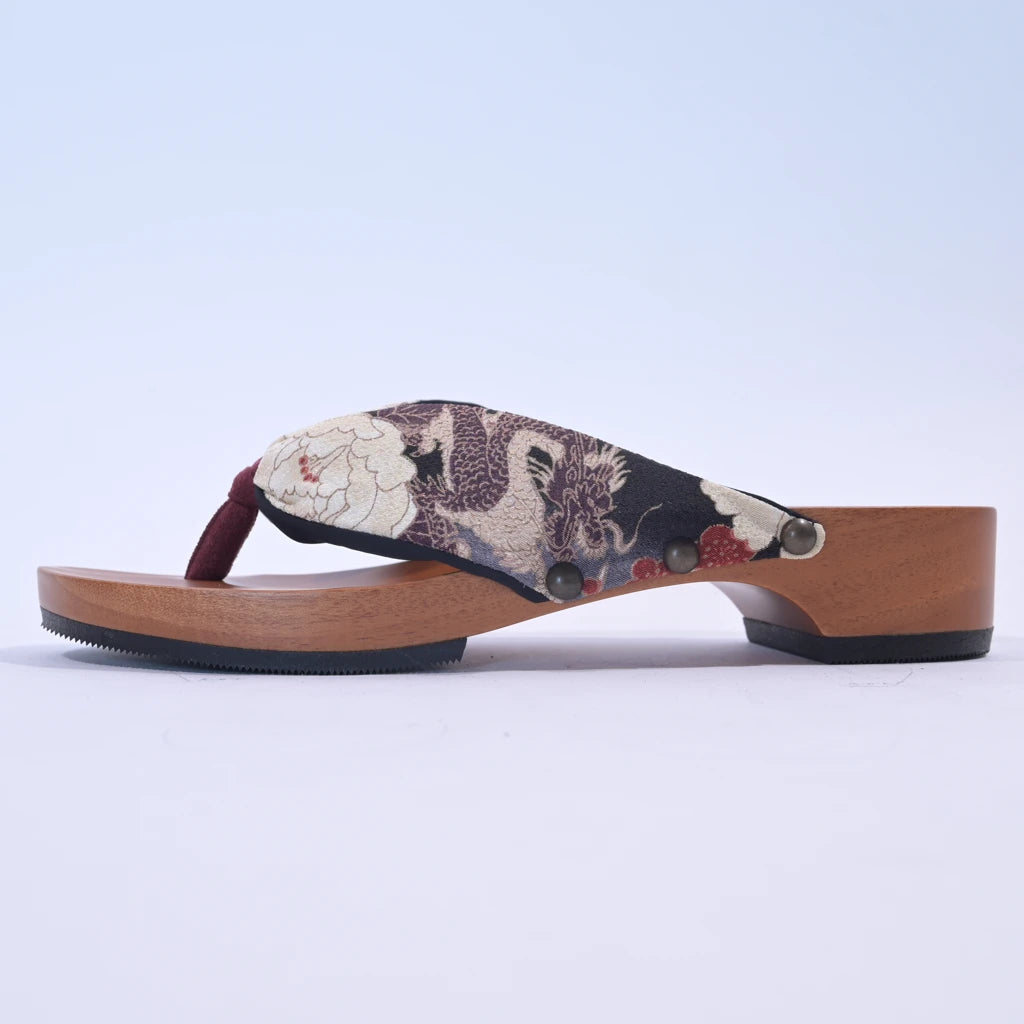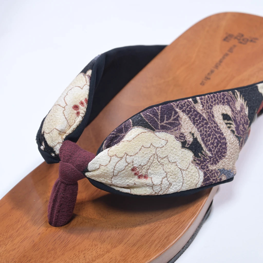 高貴な龍と優美な牡丹や梅が織りなす、風格ある鼻緒。落ち着いた色合いが、粋で洗練された雰囲気を醸し出します。